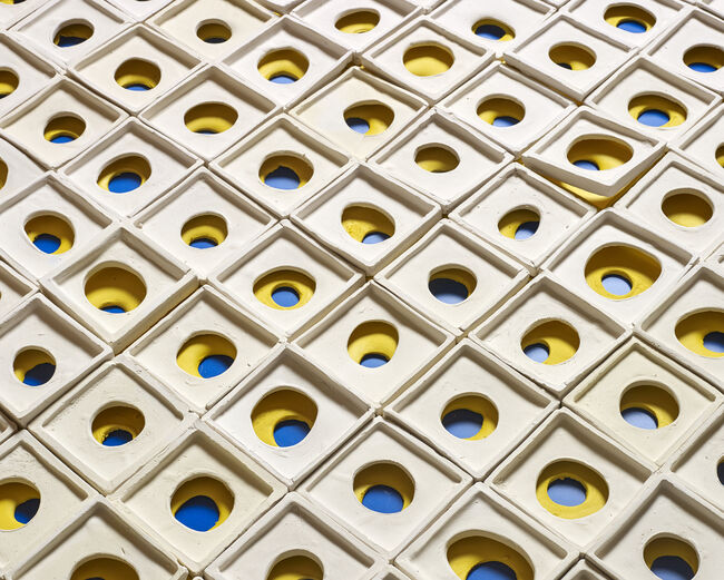 그는 점, 선, 면, 원이라는 가장 기본적인 조형 언어를 바탕으로, 켜켜이 쌓인 시간의 지층과
