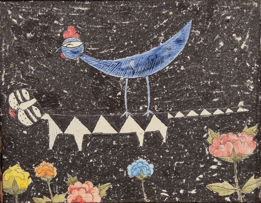 엉성한 물고기와 어리숙한 새가 서로를 바라보고, 익살맞은 호랭이가 물고기를 쫓는다.